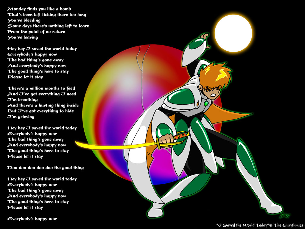 I Saved the World. A modified version of the pic below, with Fushi superimposed over a cracked Orb of chaos, along with song lyrics by The Eurythmics that seemed to fit Fushi quite well.