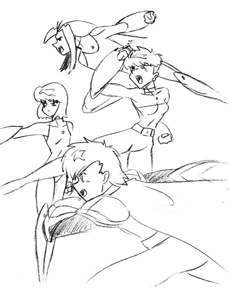 Rush Battle, rough sketch. Extremely rough. There are a few things about it that I like, so I put it up. I particularly like Yun's and Naoko's poses. You can't see Fushi in this one... 469x600, 64k.