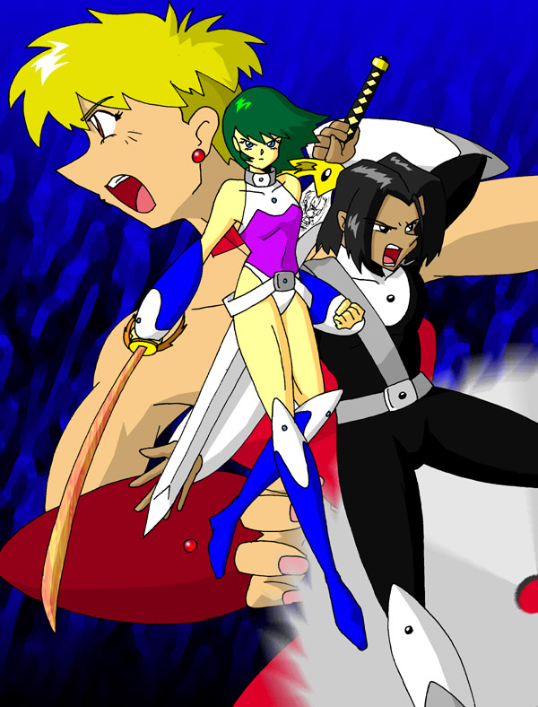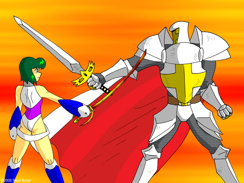 Clash. I'm still not sure about the background on this one; I'd like to do something more elaborate and interesting. Anyway, it's a picture of Naoko facing off against the Holy Knight with Chou, the Phoenix Wing Blade.