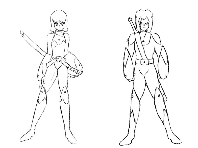 Sketches of Naoko and Yun, in their new costumes. I did this a little while back, but didn't want to put it up and spoil the fact that Yun has a sword. ^_^