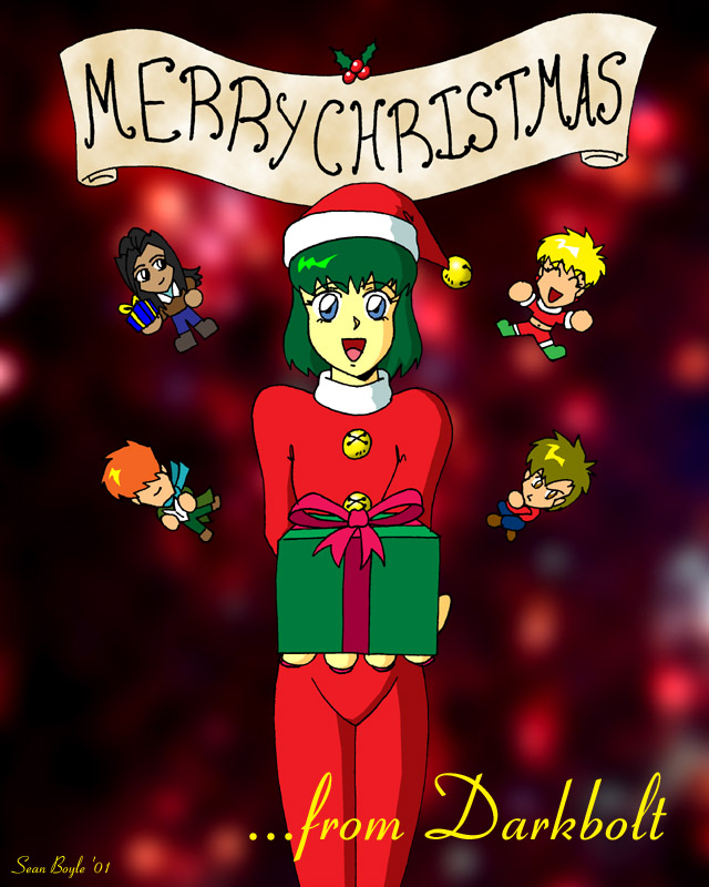 Christmas 2001Of the three X-mas designs I came up with, this one won out over the others, just on sheer cuteness alone. I think I'll use one of the others next year. This one's kind of big, so watch out. 640x800, 160k.