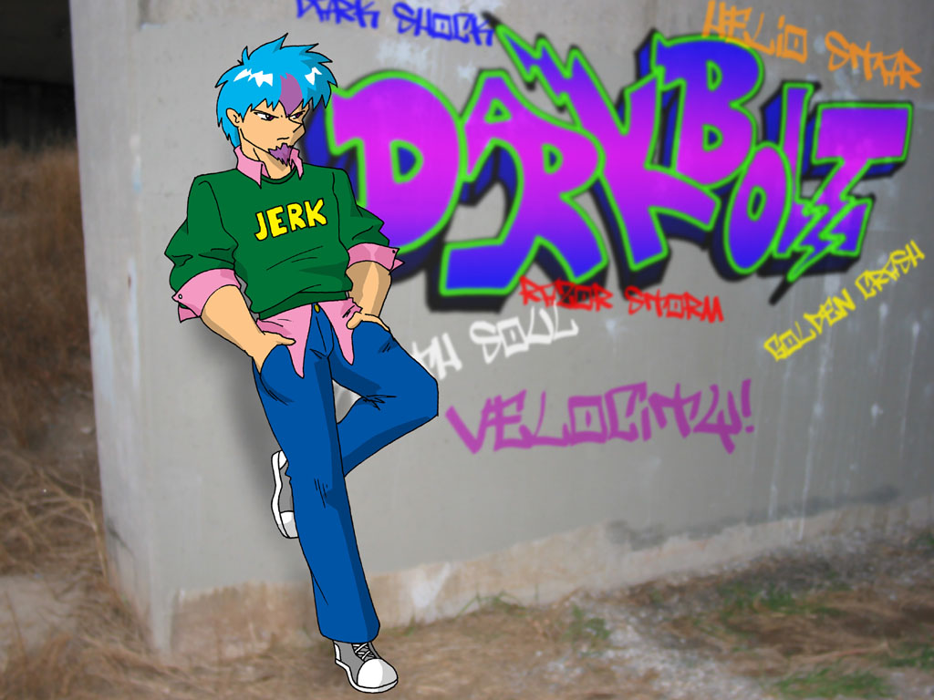 Jerk. Johji leaning on a wall covered in graffiti.