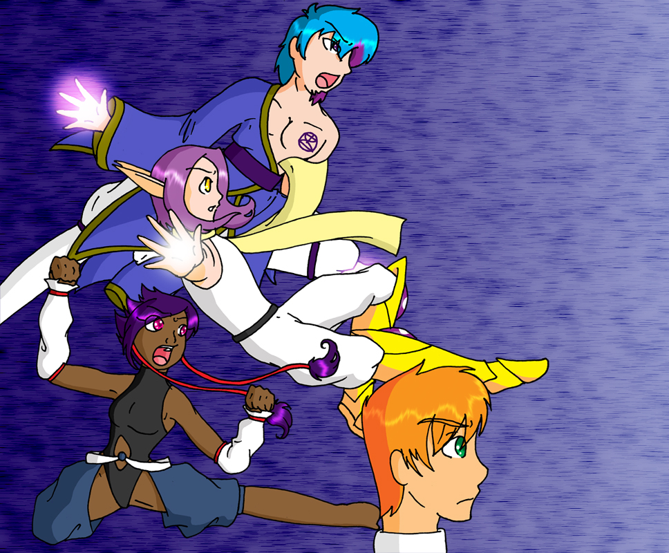 Darkbolt Inzen, by Mizzy. The main cast of Inzen, including Team Dolands training vigorously, on a T-shirt design by Mizzy. 800x800, 232k.