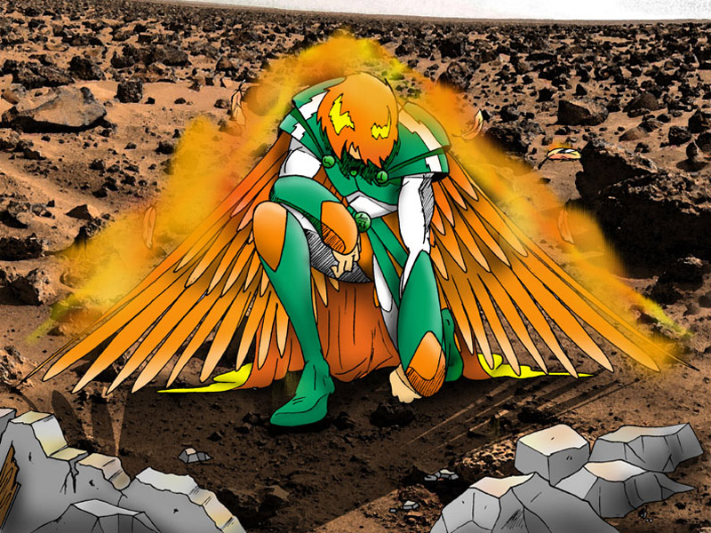 From the Ashes by Neil Weber. A phoenix-winged Fushi surrounded by a desolate Earth.