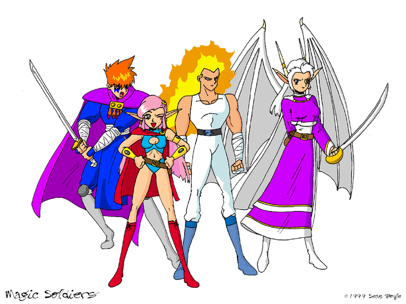 Magic Soldiers. The main cast of the anime (minus Zelthar). Rysa, Kerra, Phalin, and Whiteye. |