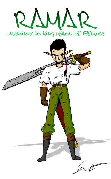 Ramar, the young elf warrior born to defeat a powerful evil wizard. Pat did a really good job playing Ramar, and I went overboard on the equipment I gave him (a sword that shot energy blasts, powerful armor, and an item that regenerates damage at an insane rate). |