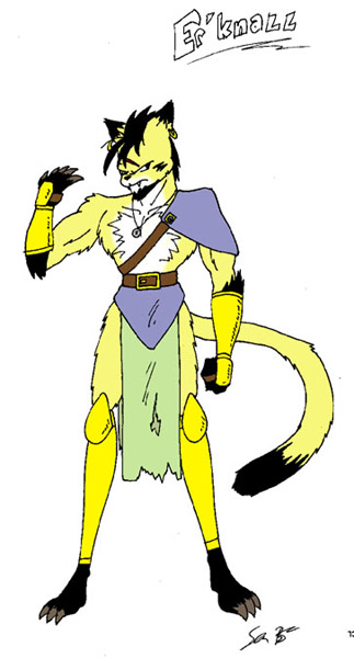 Tek-Rah Felri'An, the first picture of her. She showed up at the city of Trelgenar (a were-creature city) after it was attacked by Glorkaroth the Deep. Ger-thrall, the were-tiger general of Trelgenar, nursed her back to health. That's one of his uniforms she's wearing.