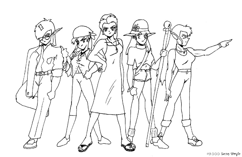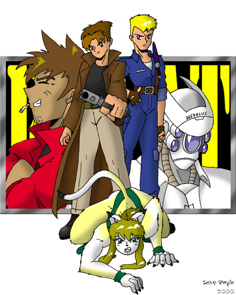 The ESWAT characters. From left to right, we've got Dr. Castor Discouri, genetic engineer, Jason Davin, "freelancer" and musician, William "Longbow" Mathes, bioroid police officer, Professor Daedalus, cyborg college professor. In the front is Selene, an experimental combat bioroid created by Dr. Dioscouri.