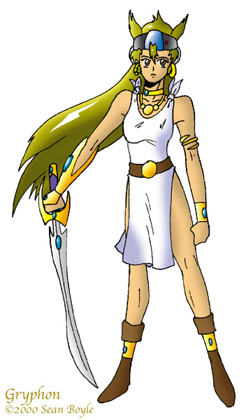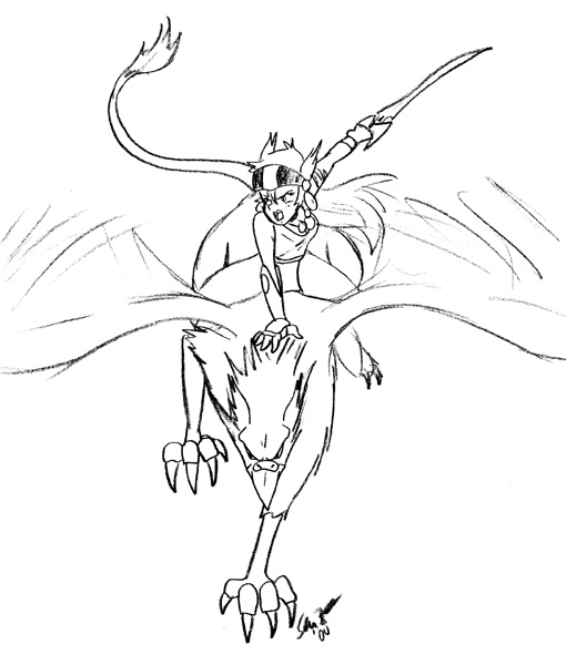 Gryphon, her sword drawn. Here's another griffin-back pic of Gryphon, this time with her sword drawn. 510x600, 80k.