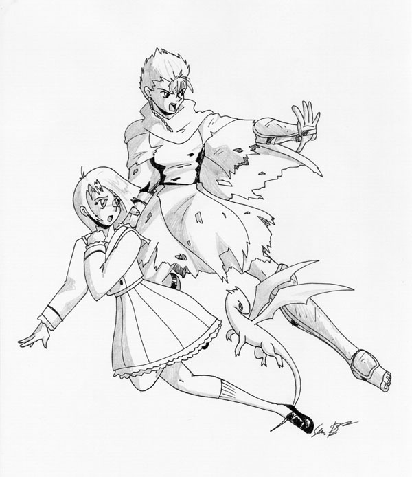 Mem and Melody. These are actually a couple of characters from 10,000 years ago in the Darkbolt storyline. I did Melody's hair wrong, and messed up her school uniform too. But overall I really like it.