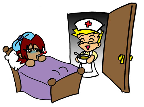 Sick Mizzy. Mizzy was sick and feeling really crappy, so I drew this picture for her to cheer her up. Yes, that's me dressed up like a nurse with a bowl of chicken soup. 500x374, 40k.