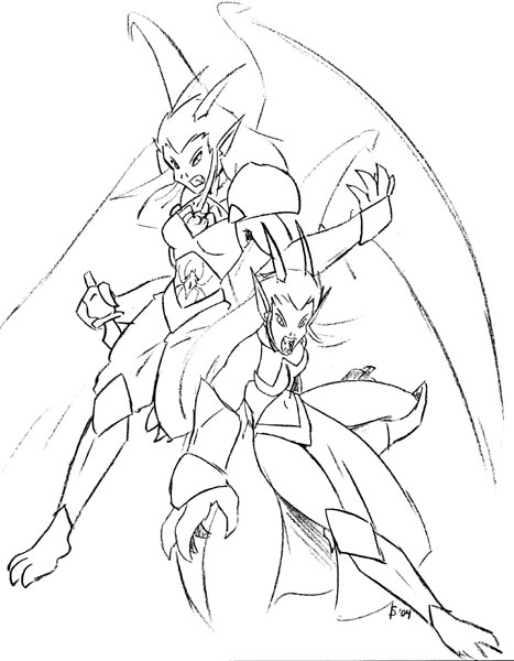 Half-dragon Drow Sisters, NPCs from my D&D game. I want to make color pictures, and their wings got a little tangled in this one. 467x600, 68k.