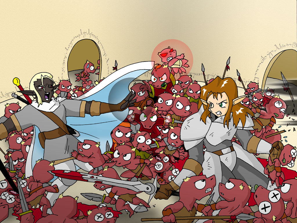 Kobolds! Here's a scene from a couple years back, when Zelthar and Miria took on an entire tribe of kobolds. The little guy with the red hair in the middle is Mar, their leader, and he's trying to use the ancient elven high magic in this chamber to resurrect a powerful red dragon whose soul is locked in the body of the baby he's holding (Miria's adopted son, Dorai). Needless to say, the kobolds lost.